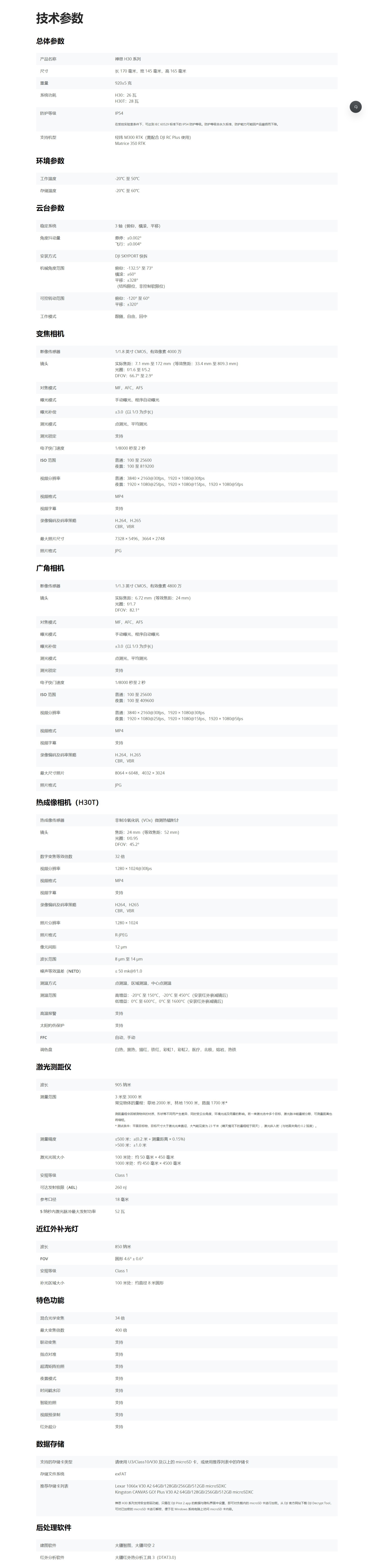 全天候多光旗舰负载禅思 H30 系列,,,,集成广角相机、、变焦相机、、热成像相机、、激光测距仪和近红外补光五大模组,,,并应用前沿智能算法,,,全面提升感知与成像能力,,突破昼夜视觉局限,,,轻松胜任公共安全、、、能源巡检、、水利林业等领域的作业任务。。。